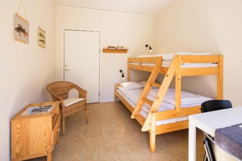 Detta dubbelrum har toalett, handfat, en sittgrupp och en uteplats. Våningssängens nedre bädd är 120 cm bred och har plats för 2 personer. Sängkläder och handdukar ingår inte. En extra avgift tillkommer om du önskar hyra.